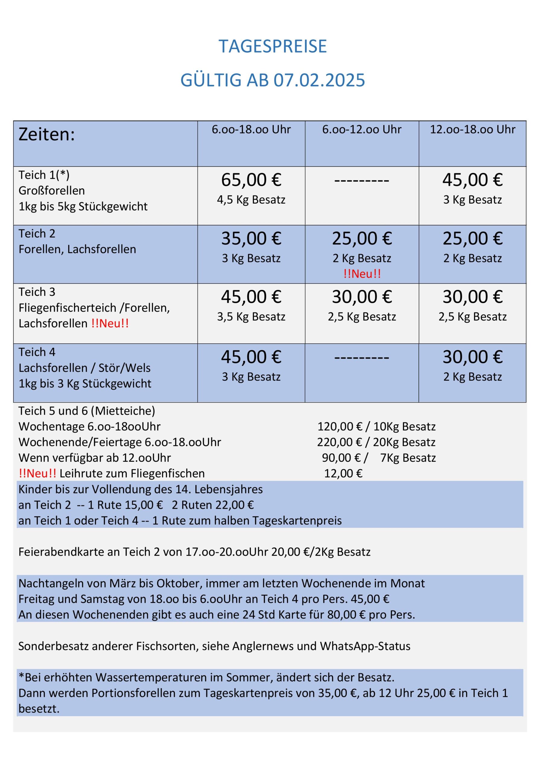 Öffnungszeiten Zeiten zum Angeln Täglich von 06 bis 18 Uhr. (1. Nov. bis 28. Feb. von 07 bis 18 Uhr) Ruhetage: Montag, Dienstag & Mittwoch
